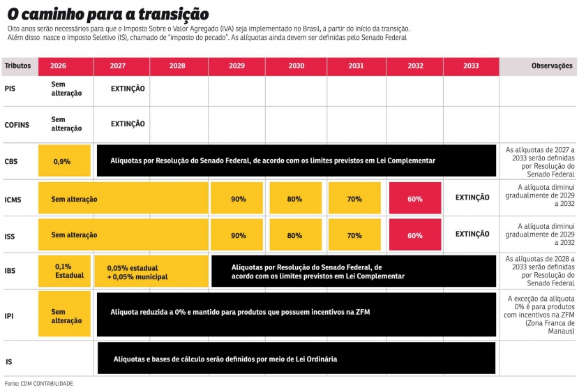 Con l’intento di fornire un quadro generale sintetico delle evoluzioni fiscali in Brasile, previste dal 2026 al 2033, forniamo la tabella dell’insieme, la quale per essere applicata ha la necessità di verifiche specifiche per ogni caso, inclusi location e settore d’attività.